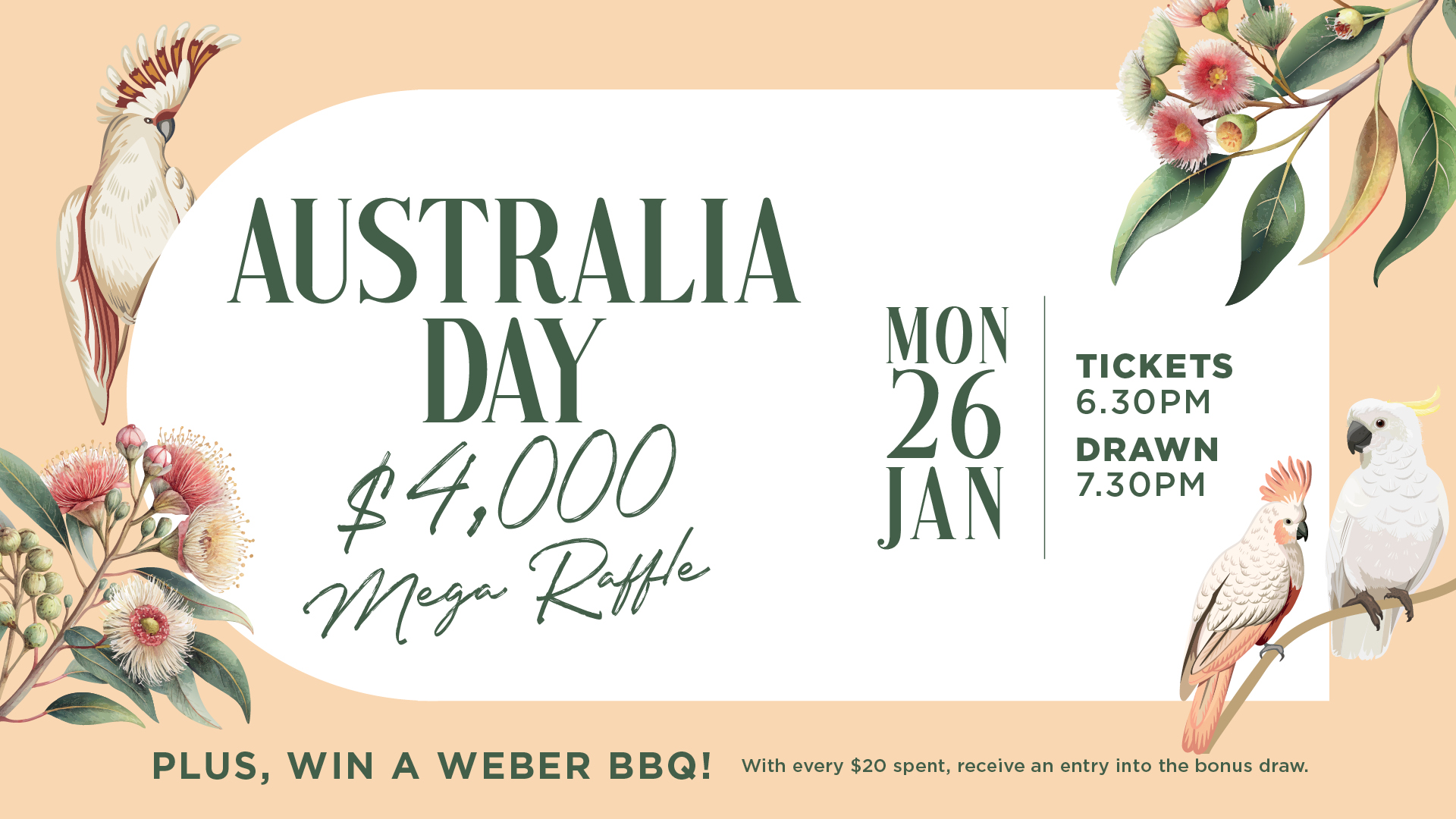 Ready to spend Australia Day with something exciting? Join us at Merrylands RSL for our Australia Day Mega Raffle, your chance to share in $4,000 worth of exciting prizes.